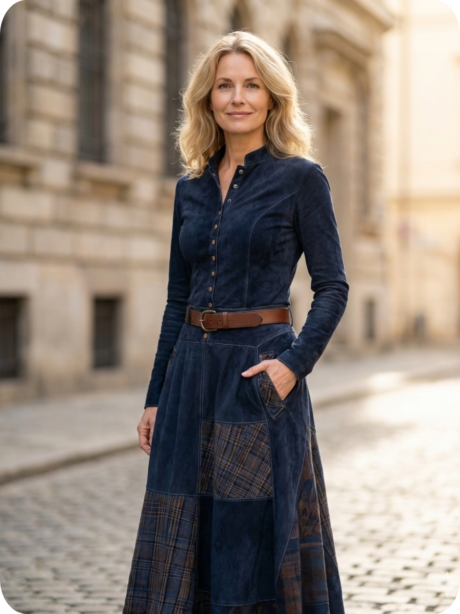 Ta zamszowa sukienka maxi została zaprojektowana z myślą o chłodniejszych miesiącach i codziennej elegancji. Górna część z miękkiego eko-zamszu porządkuje sylwetkę dzięki dopasowanemu krojowi, stójce i metalowym guzikom. Rozkloszowany dół z panelami w kratę nadaje całości spokojnego ruchu i warstwowego charakteru, dobrze sprawdzającego się w stylizacjach jesienno-zimowych. Dołączony pasek pozwala delikatnie zaznaczyć talię.