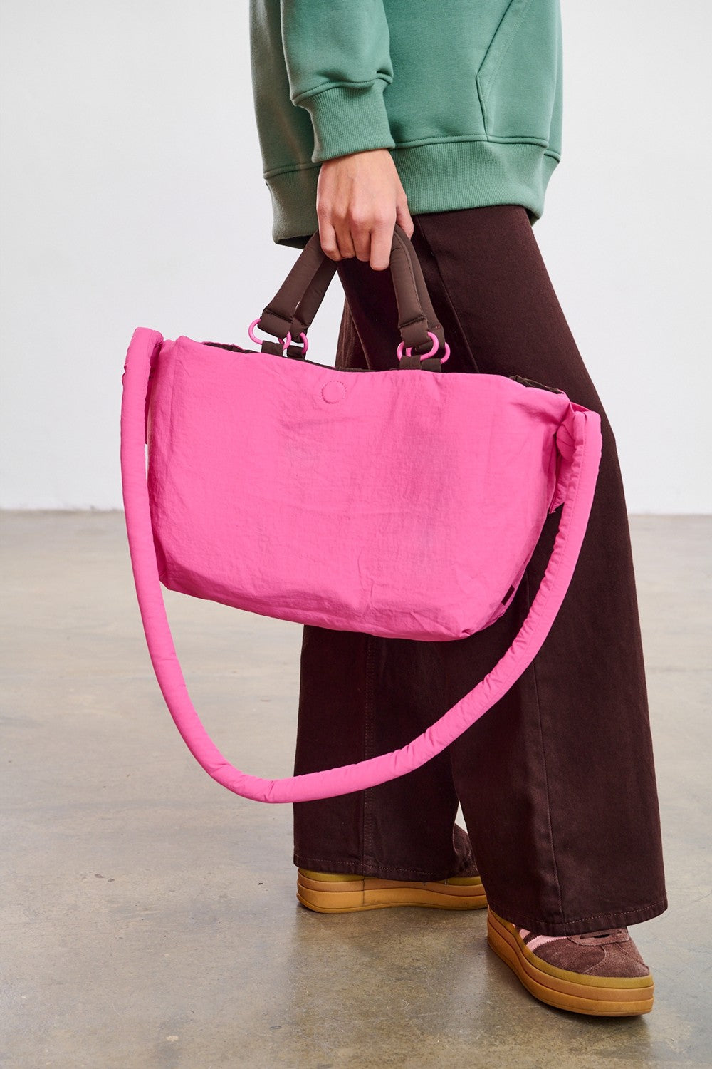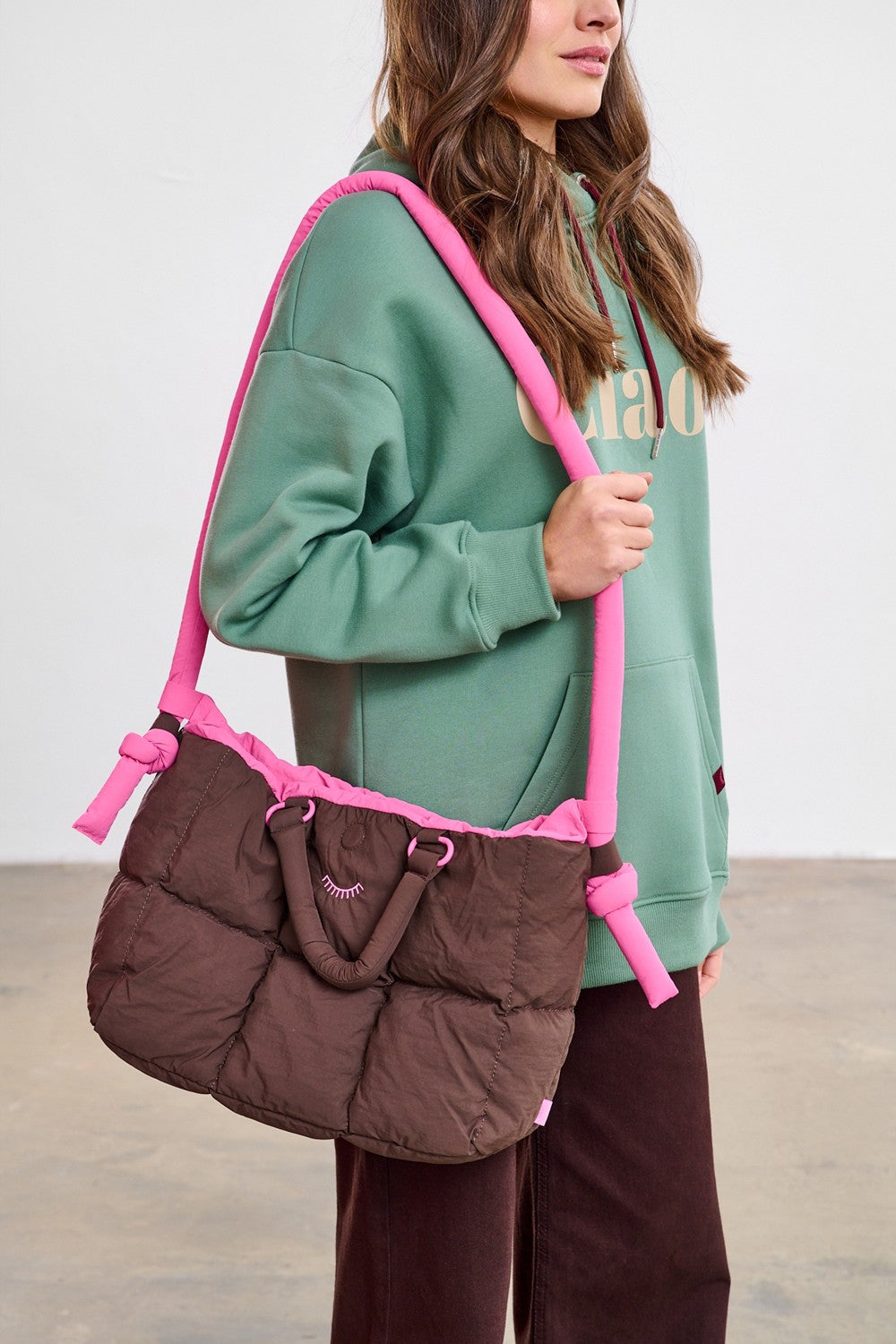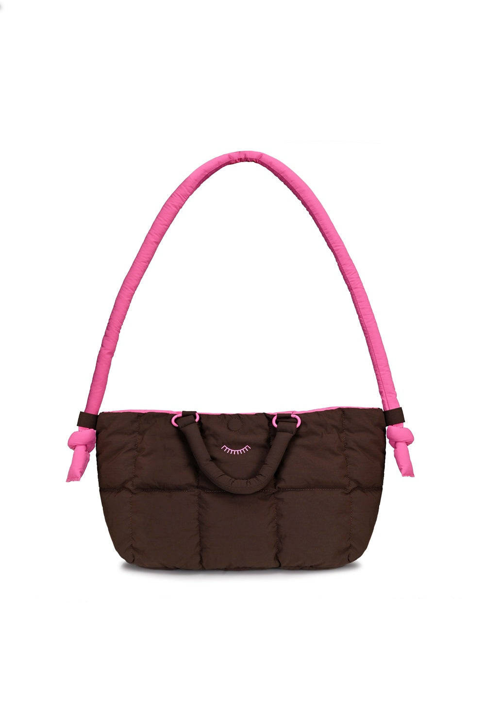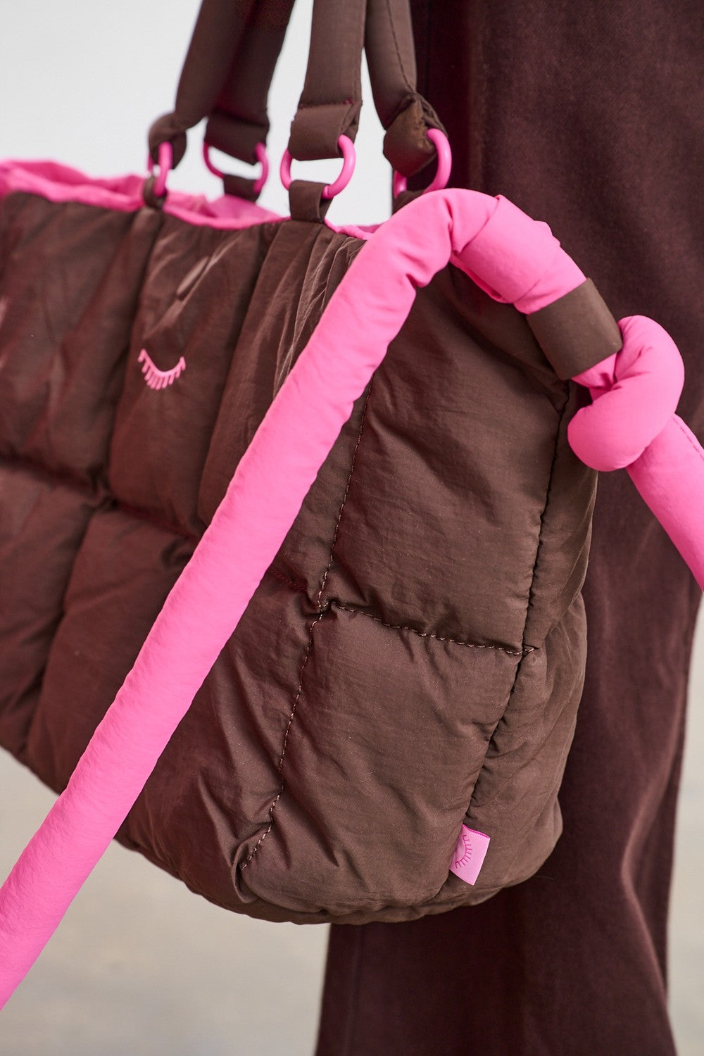 Torba jest nie tylko piękna, ale i funkcjonalna. Miękka, pikowana forma jest lekka i pojemna. Posiada dwa komplety uchwytów: krótkie, brązowe do ręki oraz długie, różowe na ramię, z ozdobnymi wiązaniami. To dodatek, który dopasuje się do Ciebie.