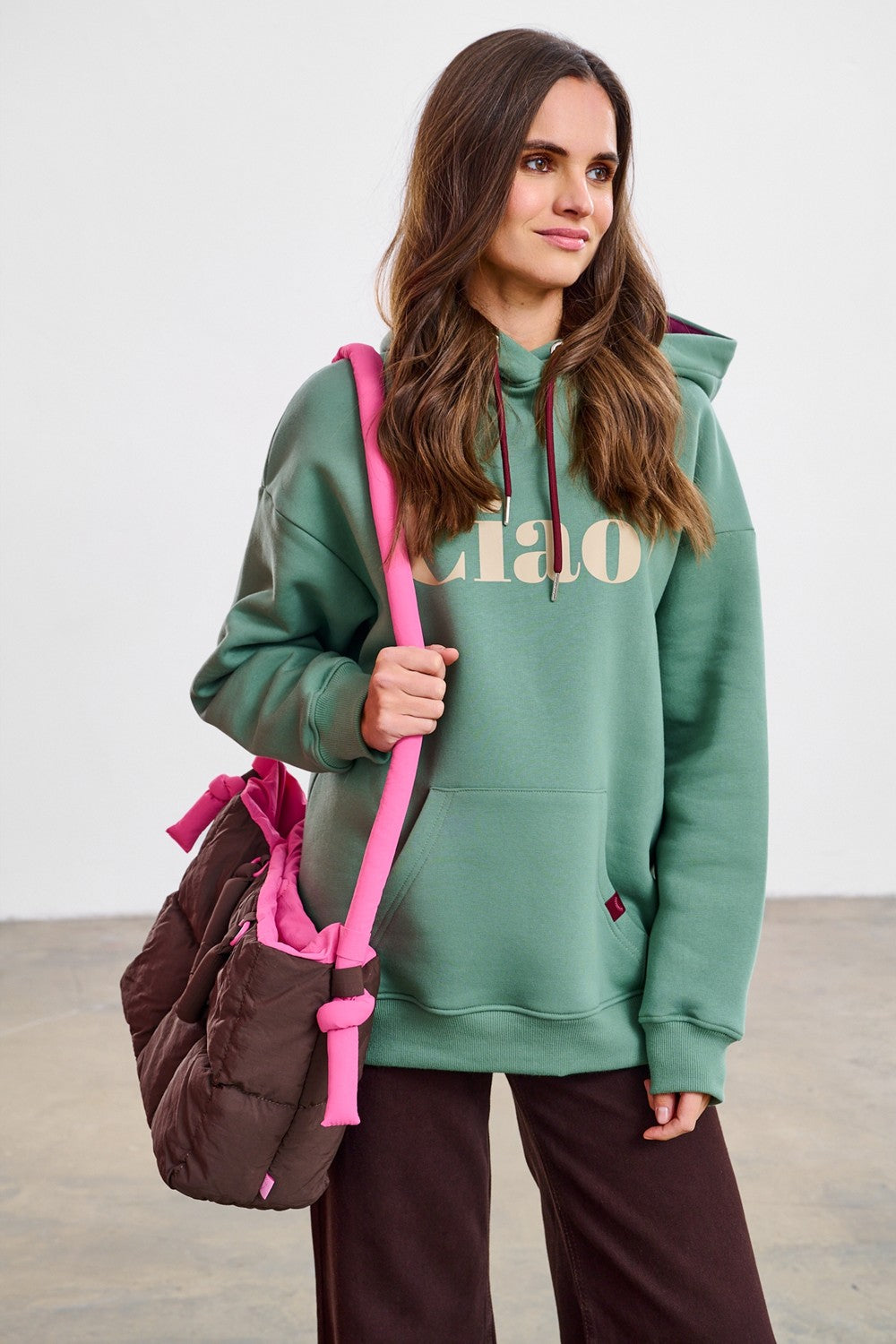 Torba Rose Latte to idealny balans między stonowaną elegancją a radosną energią. Ten dwustronny, pikowany model pozwala Ci bawić się modą każdego dnia. Jedna strona to głęboki, czekoladowy brąz, idealny do jesiennych płaszczy. Druga to nasycony róż, który ożywi każdą stylizację.