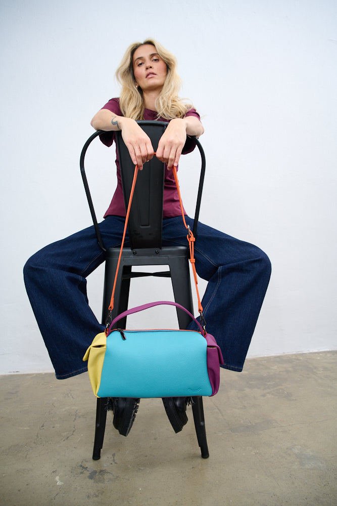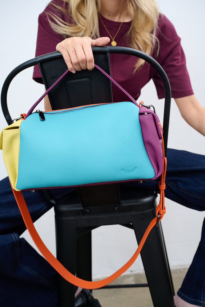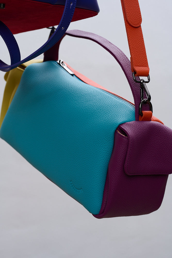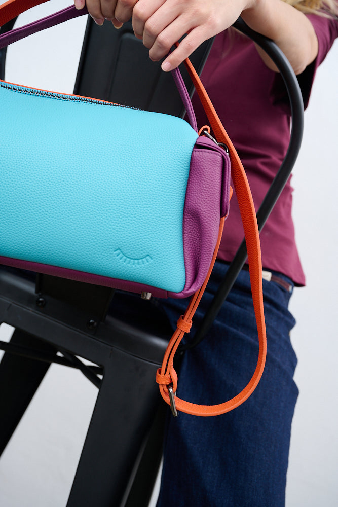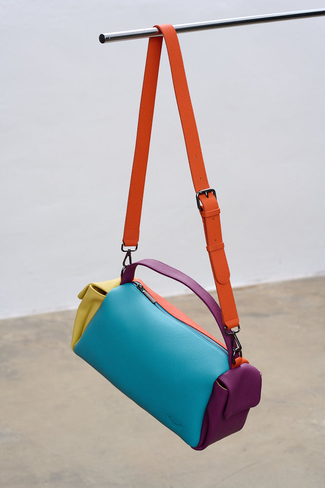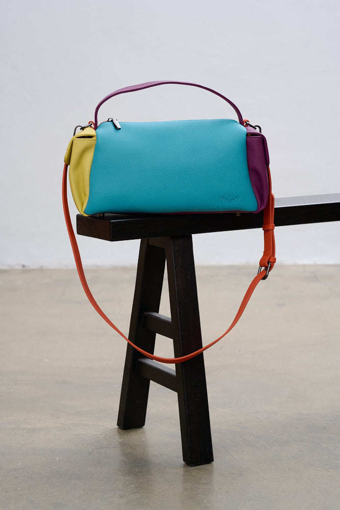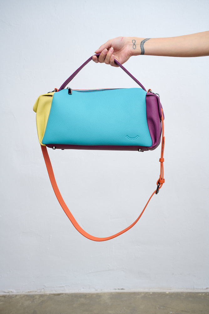 Torebka Dopamine Joy to prawdziwa bomba energetyczna i odważny manifest stylu. Główny panel w kolorze turkusowym łączy się z pomarańczowym tyłem i paskiem, fioletowymi uchwytami i żółtą kieszenią boczną.