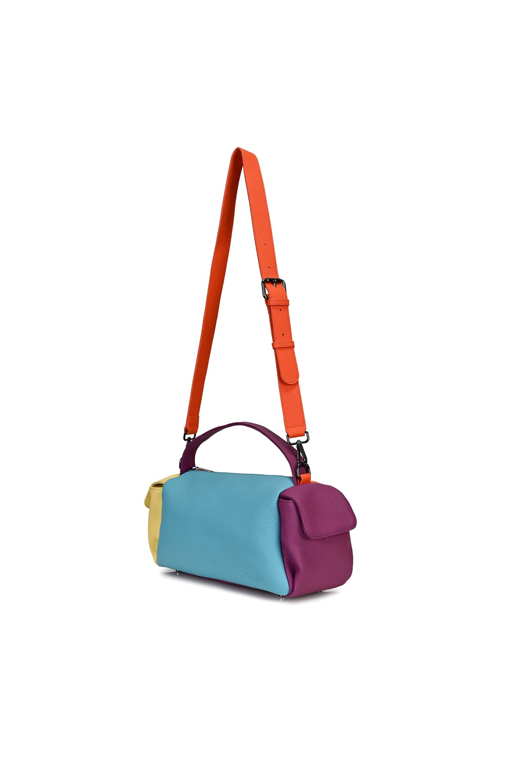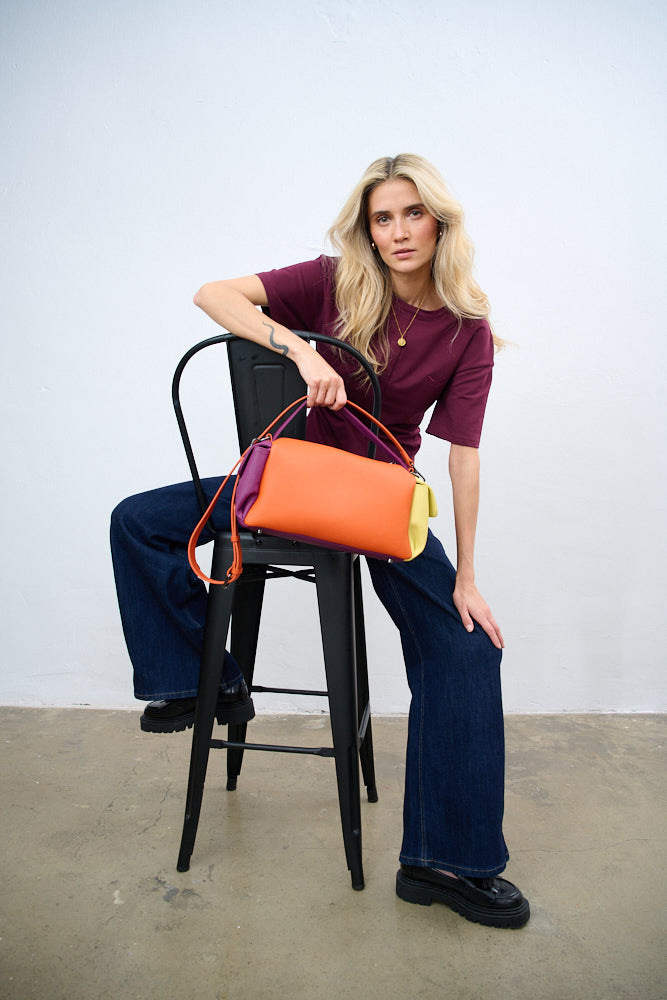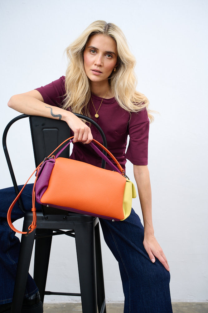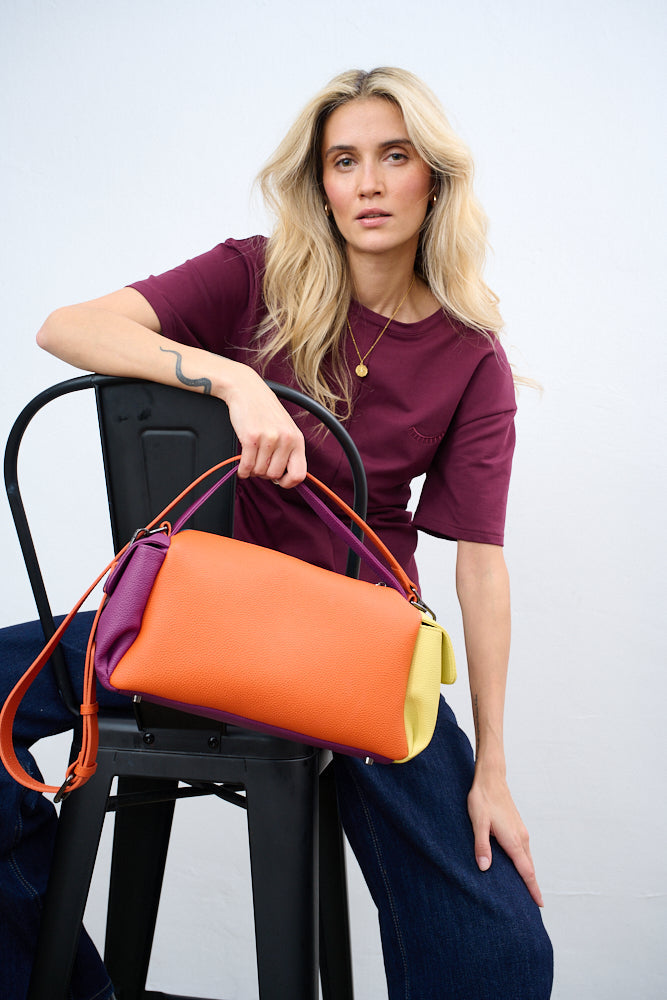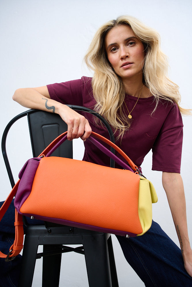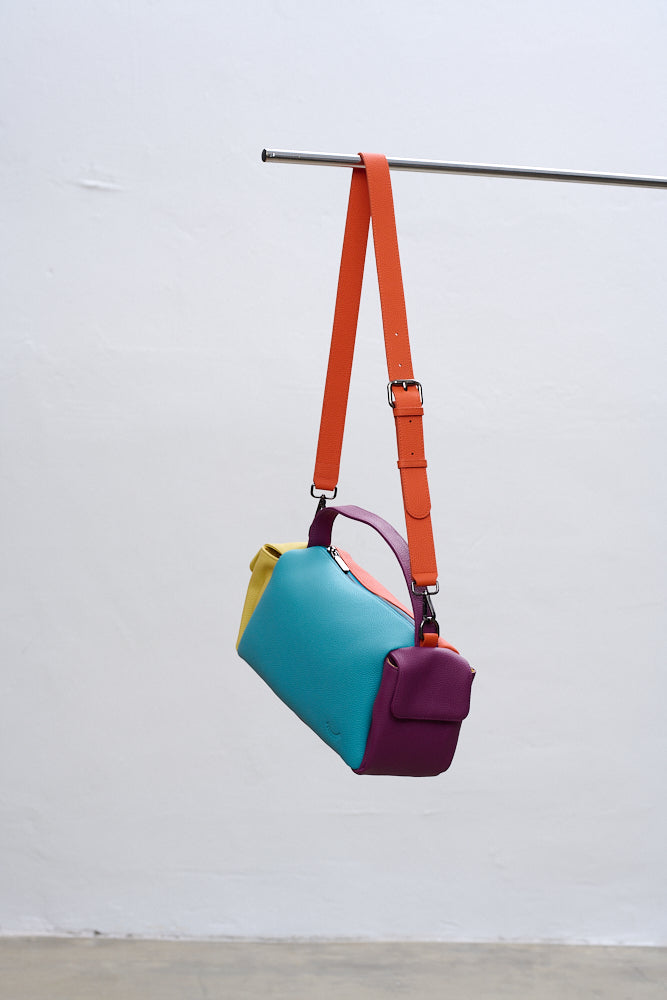 Torebka Dopamine Joy to prawdziwa bomba energetyczna i odważny manifest stylu. Główny panel w kolorze turkusowym łączy się z pomarańczowym tyłem i paskiem, fioletowymi uchwytami i żółtą kieszenią boczną.