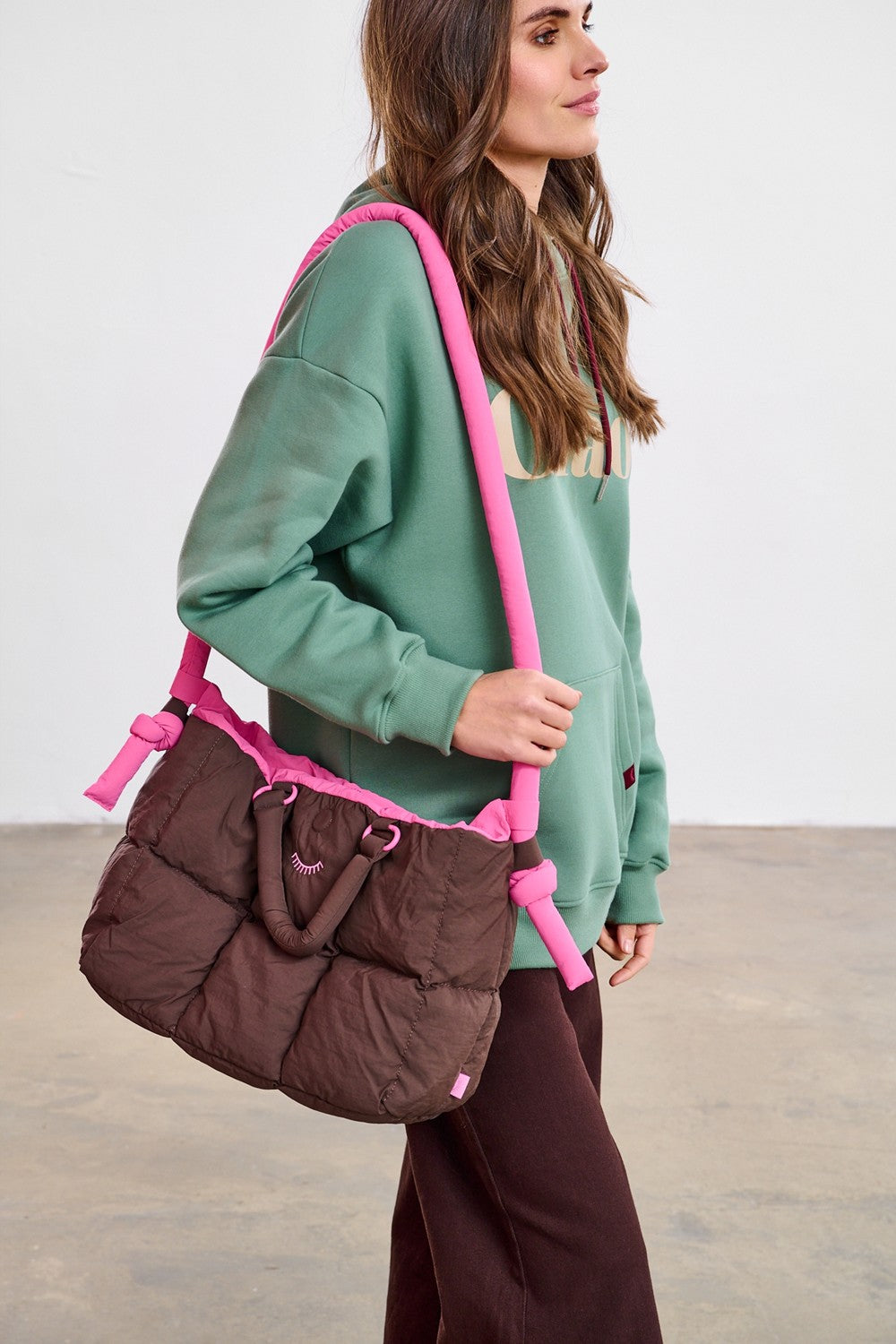 Torba jest nie tylko piękna, ale i funkcjonalna. Miękka, pikowana forma jest lekka i pojemna. Posiada dwa komplety uchwytów: krótkie, brązowe do ręki oraz długie, różowe na ramię, z ozdobnymi wiązaniami. To dodatek, który dopasuje się do Ciebie.