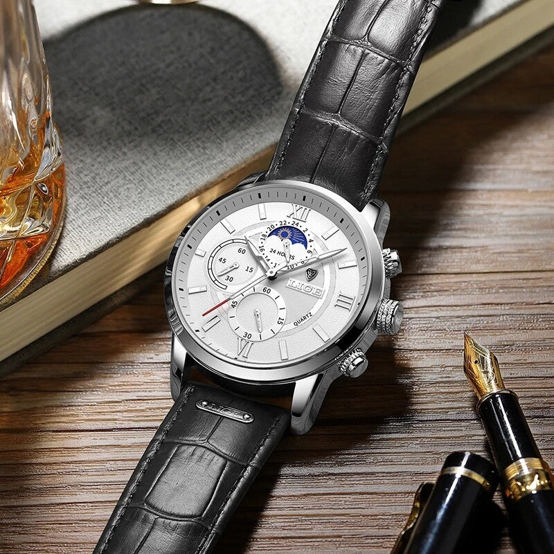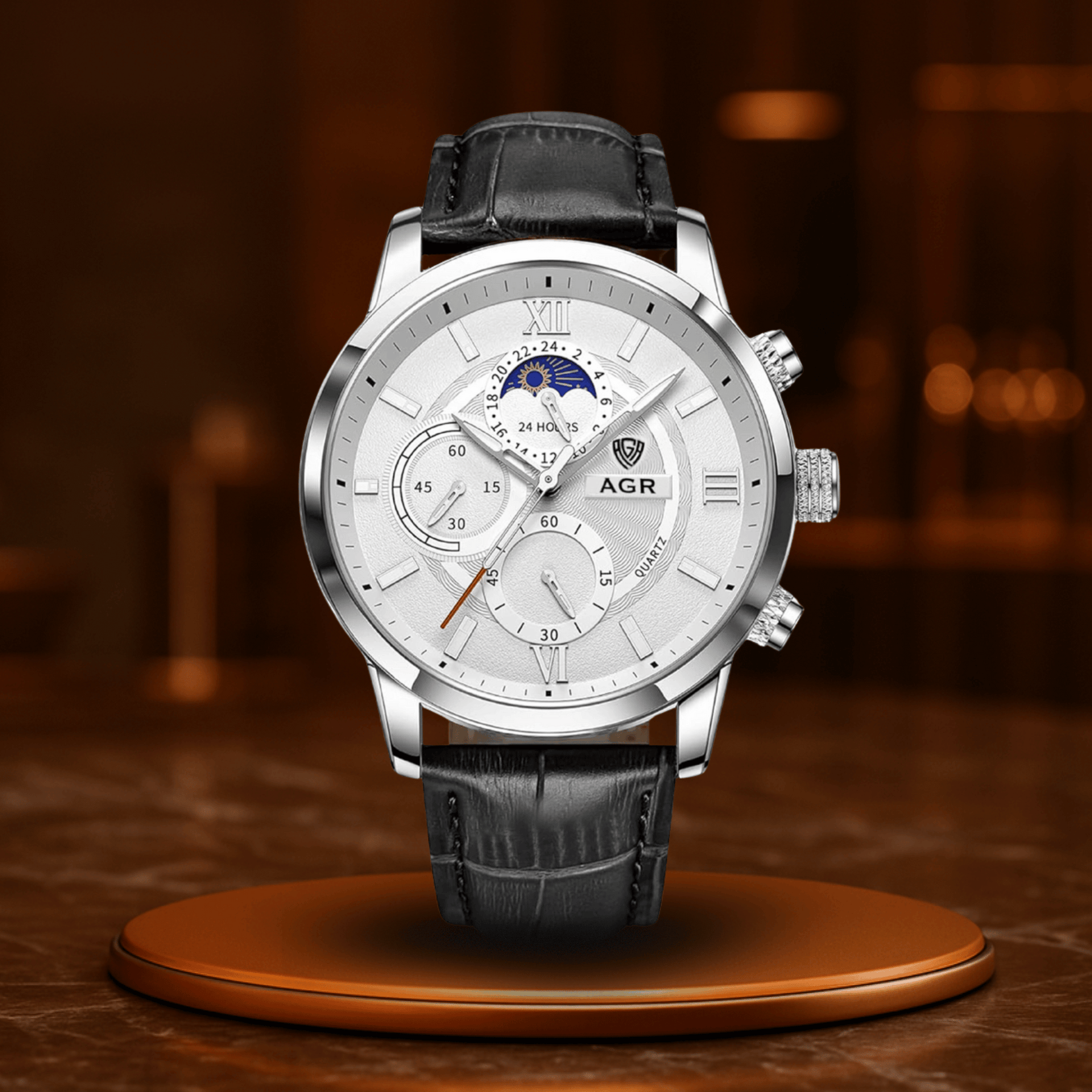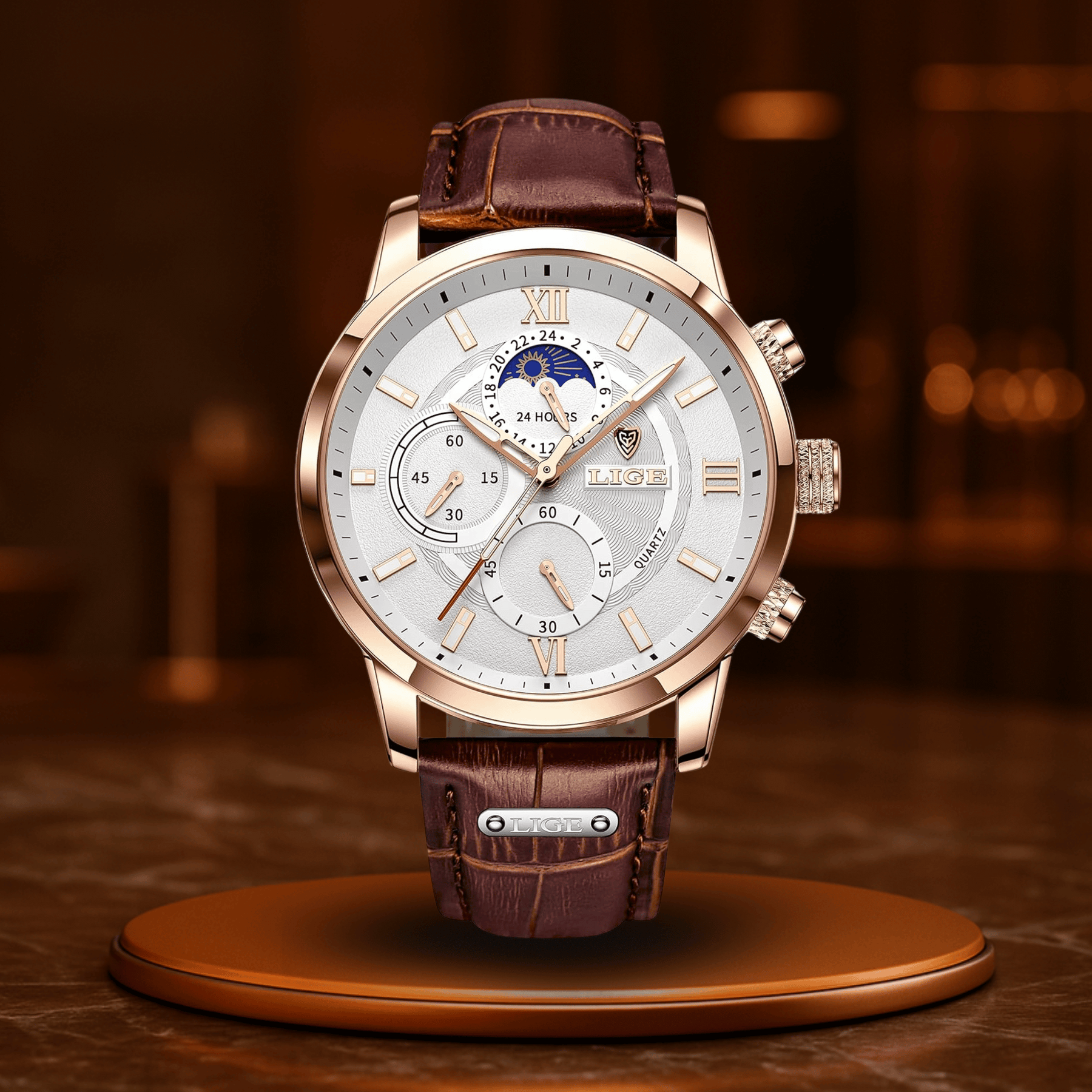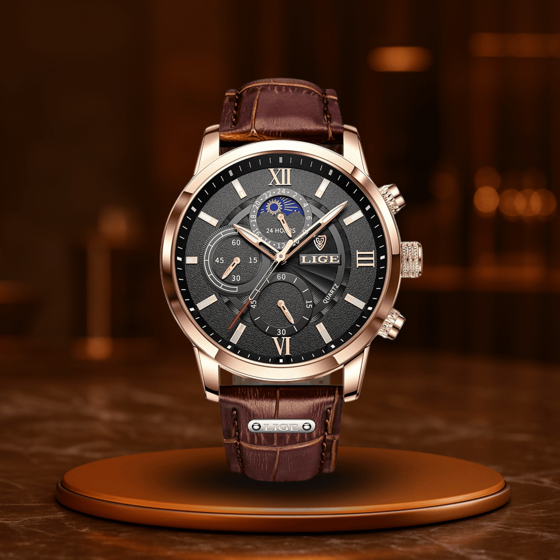 Faza – Wydanie Ziemi od Maison Solstice to doskonałe wyrażenie subtelnej elegancji z głębią. Dzięki wyrafinowanemu wyświetlaczowi fazy Księżyca, klasycznej funkcji chronografu oraz ziemskiemu skórzanemu paskowi w pięknym brązowym kolorze, łączy naturę, technologię i poczucie czasu w obiekt stylowy dla nowoczesnego dżentelmena.